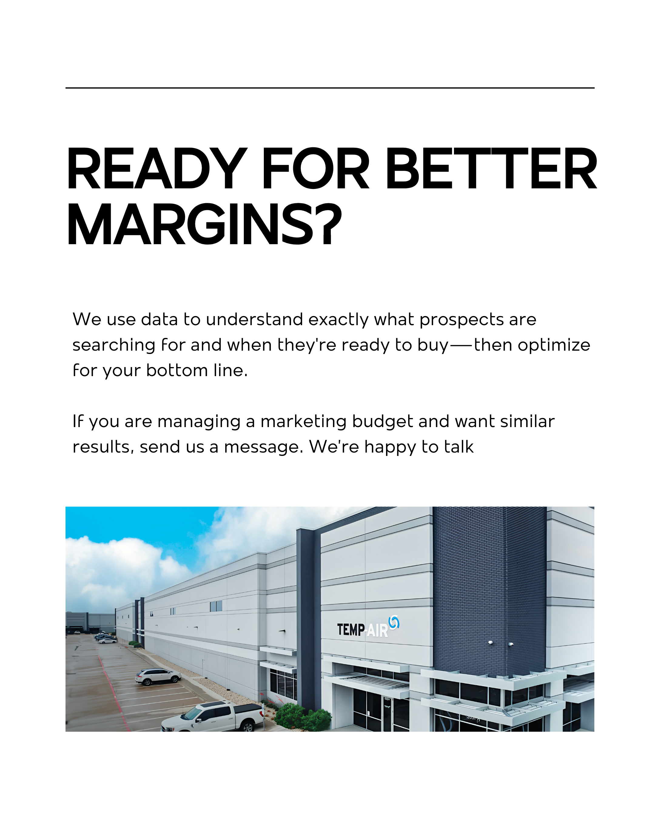 Our team at 360 Solutions developed and managed a Google Ads campaign for Temp-Air Sales to increase online visibility and generate qualified leads. We created targeted ad groups with compelling copy and keyword strategies tailored to Temp-Air’s products and services. By monitoring performance and optimizing throughout the campaign, we were able to drive more traffic, capture potential customers at key decision-making moments, and support Temp-Air’s overall brand growth in the HVAC market.